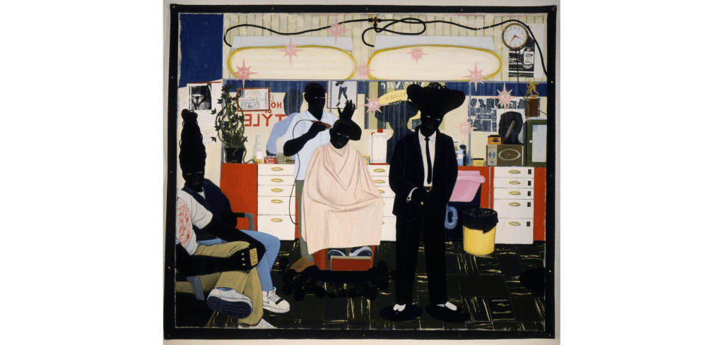 Un ejemplo de ello es el cuadro De Style (1993), en el que se recurre al formato monumental de artistas faraónicos como Delacroix, Rubens o Géricault, pero con el fin de plasmar una escena, en principio, ordinaria: una barbería de barrio. Marshall demuestra que la cotidianeidad afroamericana puede alcanzar, mediante el arte visual, la grandeza simbólica de la que gozaron momentos clave de la historia universal y los pasajes bíblicos (Frankel, 2025). Su obra le otorga un halo de excepcionalidad a lo común, elevando la vivencia negra a un plano de reconocimiento universal.